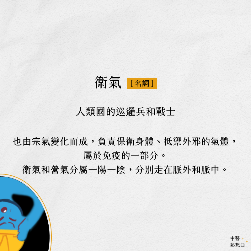 也由宗氣變化而成,負責保衛身體、抵禦外邪的氣體,屬於免疫的一部分。